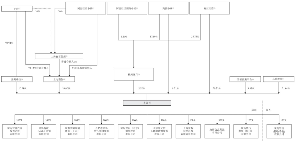 作为斑马智行的两大核心股东,阿里巴巴与上汽集团通过下属主体间接持股并掌控相应投票权。阿里巴巴方面通过上海赛为、浙江天猫、淘宝中国及杭州灏月四大主体,合计持有公司已发行股本约41.67%,控制37.09%的投票权;上汽集团则通过上海赛云管理、上海赛为及嘉兴瑞佳三大主体,合计持有公司已发行股本约32.9%,控制35.48%的投票权。